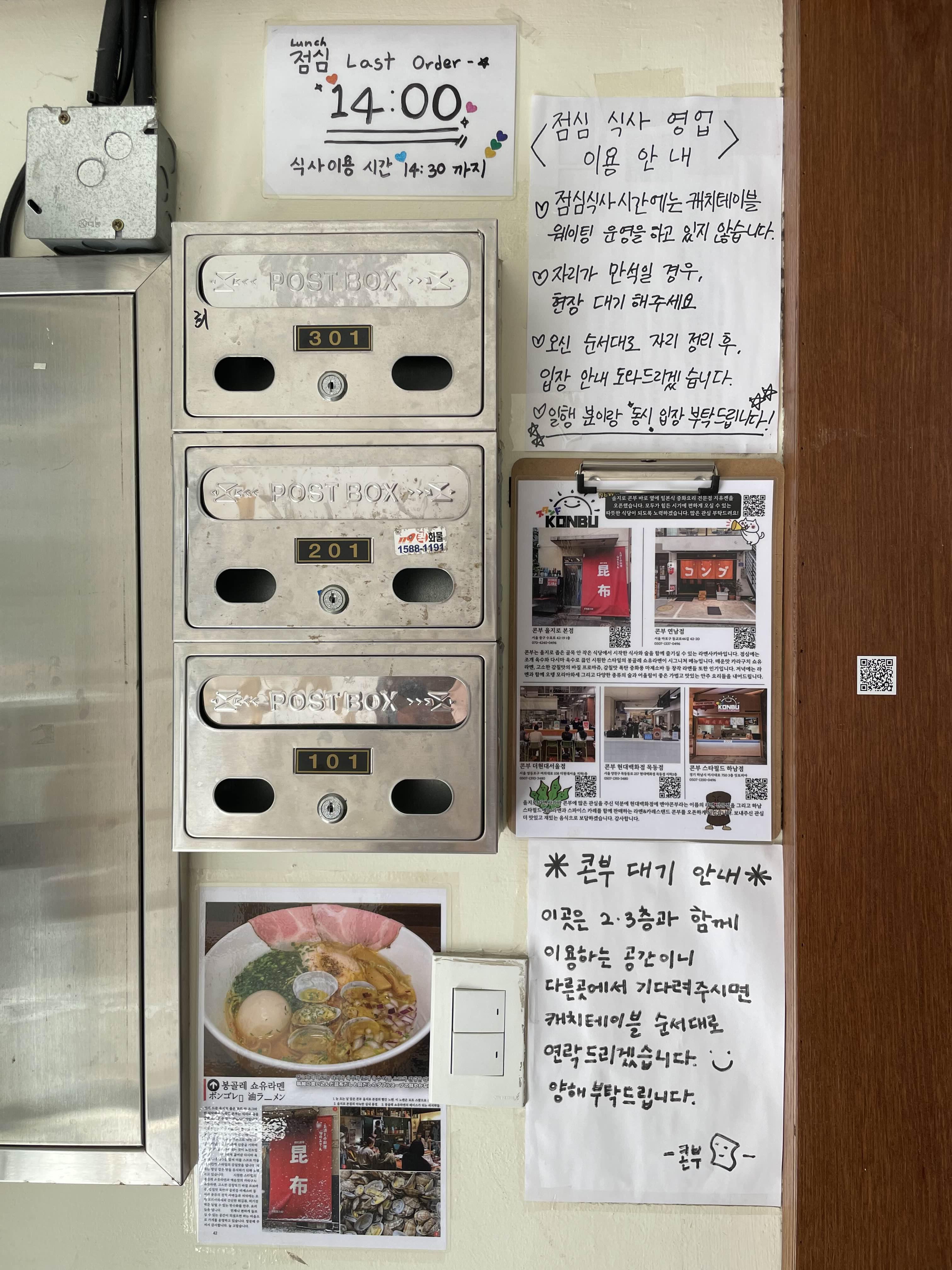 콘부라멘은 점심 라스트 오더가 14시이고 식사 이용 가능한 시간은 14시 30분까지라고 하니, 14시 전에 방문하시는 걸 추천드려요 :) 그리고 점심식사 시간에는 캐치 테이블 웨이팅을 운영하지 않는다고 하니 점심시간에 방문 예정이신 분은 이점 참고하세요.