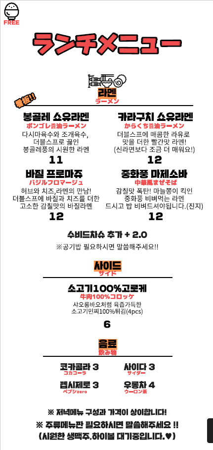 가게 메뉴판이에요. 방문하실 분들은 메뉴판 참고하세요 :)