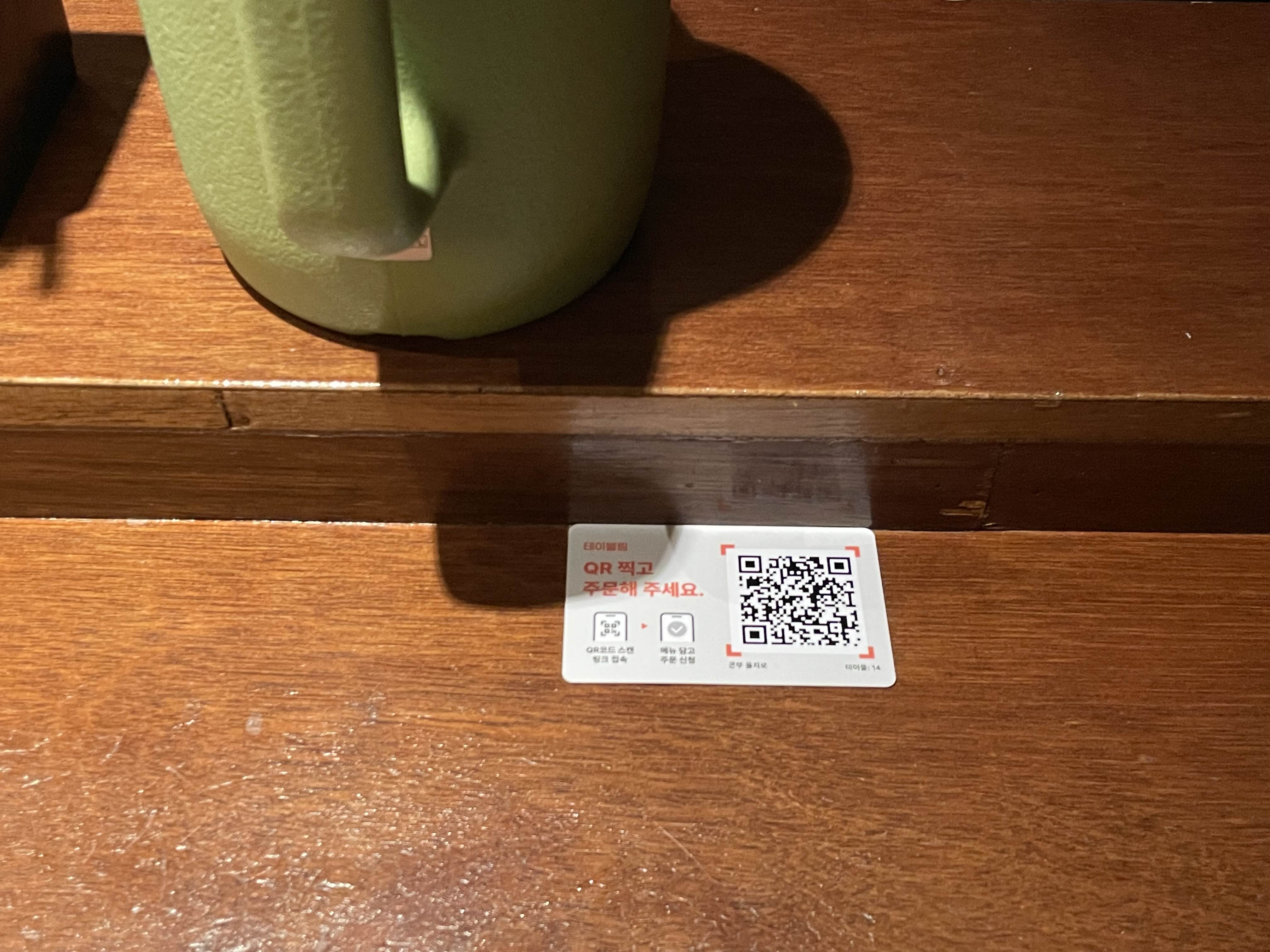 테이블에는 다양한 소스류들이 배치되어 있습니다. 주문은 테이블에 붙어있는 QR코드를 통해서 해주시면 돼요.